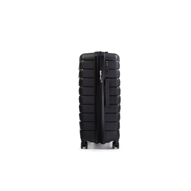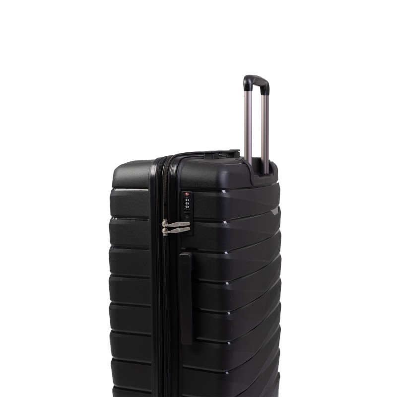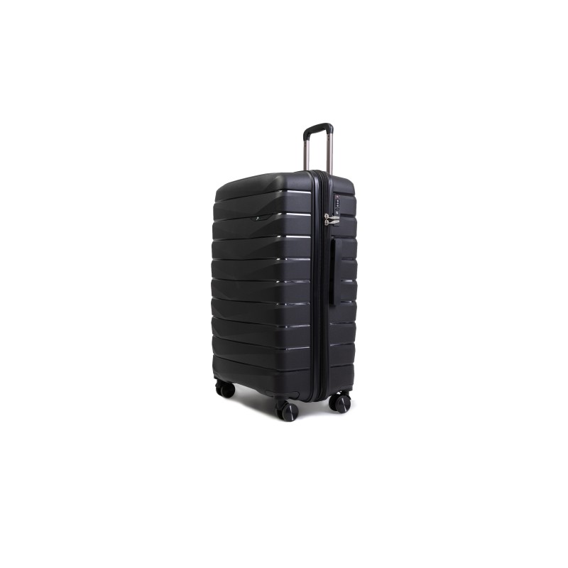 Βαλίτσα μεγάλη PP με σκληρό και ιδιαίτερα ελαφρύ περίβλημα.Διαθέτει εσωτερικό τηλεσκοπικό μηχανισμό τρόλεϊ αλουμινίου, 4 διπλούς τροχούς, πλαϊνό χερούλι και κλειδαριά TSA.Εσωτερικά έχει επένδυση με φόδρα υψηλής ποιότητας και 2 ανεξάρτητα διαμερίσματα.