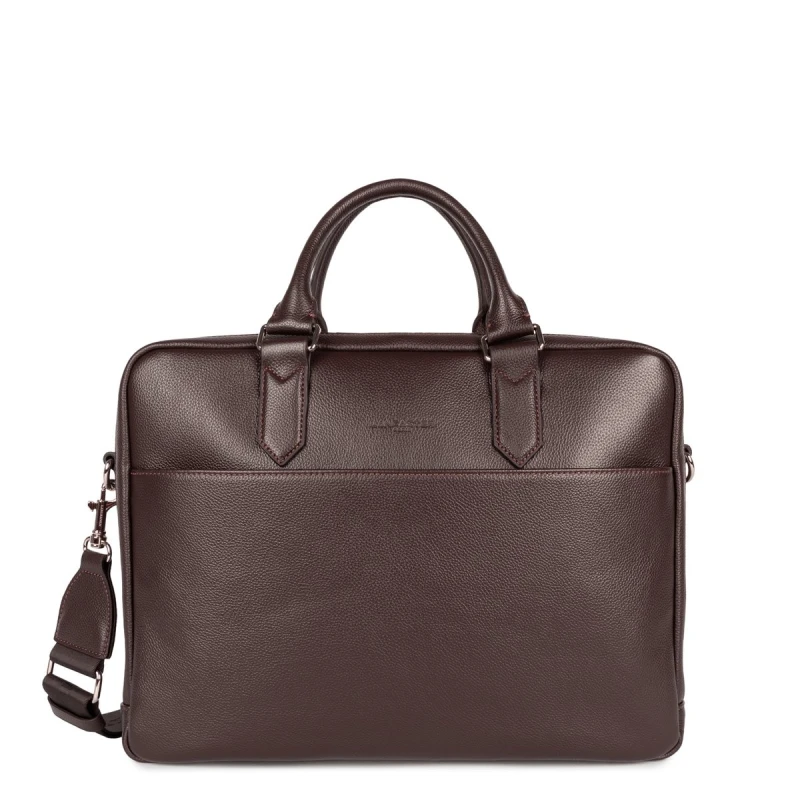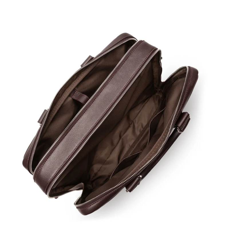 Αυτή η θήκη εγγράφων είναι κατασκευασμένη από δέρμα αγελάδας με κόκκους. Διαθέτει μια εξωτερική τσέπη με φερμουάρ στο πίσω μέρος, μια εξωτερική τσέπη με φερμουάρ στο μπροστινό μέρος και δύο κύριες θήκες. Η μία κύρια θήκη περιλαμβάνει μια διπλή εσωτερική τσέπη και η άλλη διαθέτει μια υποδοχή για φορητό υπολογιστή 15" και μια εσωτερική τσέπη με φερμουάρ.